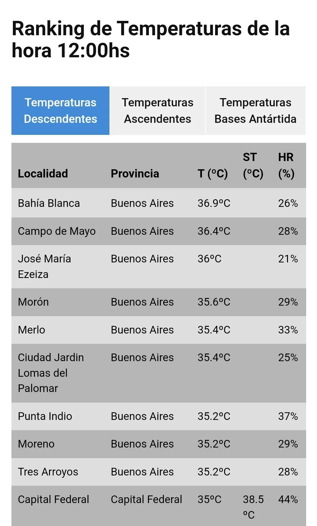El podio fue para Bahía Blanca con 36,9° secundada por Campo de Mayo con 36,4° y Ezeiza con 36°.