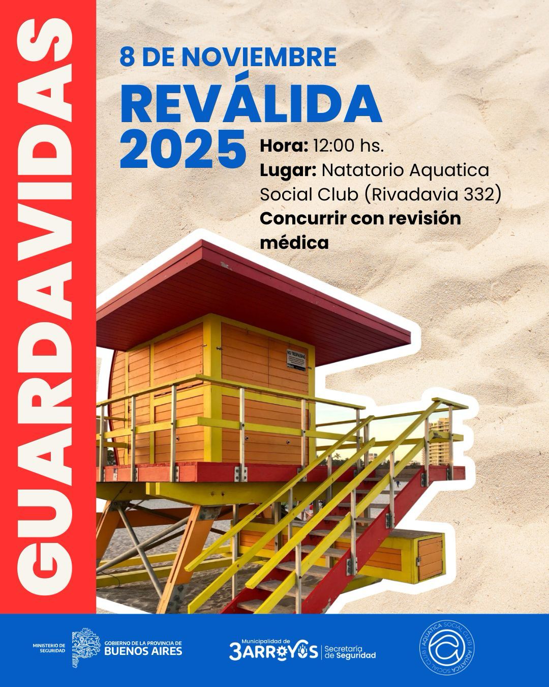 El Ministerio de Seguridad de la Provincia de Buenos Aires y la Secretaría de Seguridad de la Municipalidad de Tres Arroyos informan a los guardavidas del distrito que el próximo 8 de noviembre se llevará a cabo la reválida en el Natatorio Aquática Social Club, ubicado en Rivadavia 332.