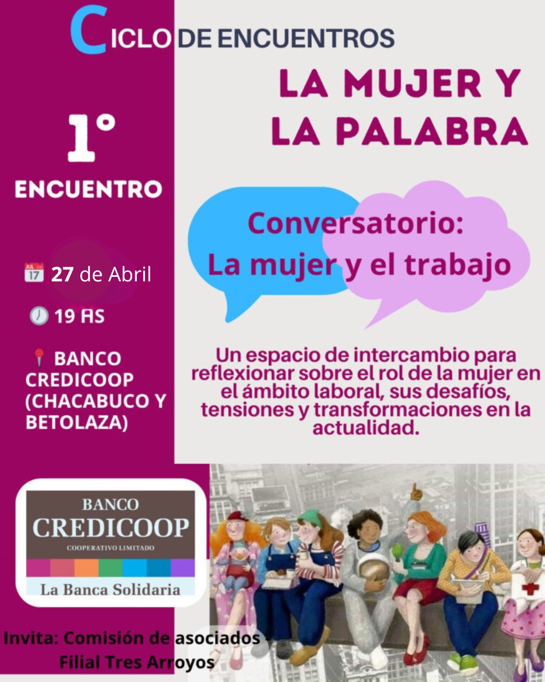 La Comisión de Asociados de la filial Tres Arroyos del Banco Credicoop invita a la comunidad a participar del primer encuentro del ciclo “La mujer y la palabra”, un espacio de intercambio y reflexión que busca poner en diálogo distintas miradas sobre el rol de la mujer en la sociedad actual.
