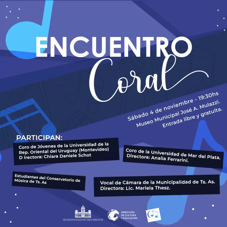 La Dirección de Cultura y Educación de la Municipalidad de Tres Arroyos, invita al público al Encuentro Coral, que se llevará a cabo el sábado 04 de noviembre a las 19.30 horas en el Museo Municipal José. A Mulazzi – Av. San Martín 323, con entrada libre y gratuita.